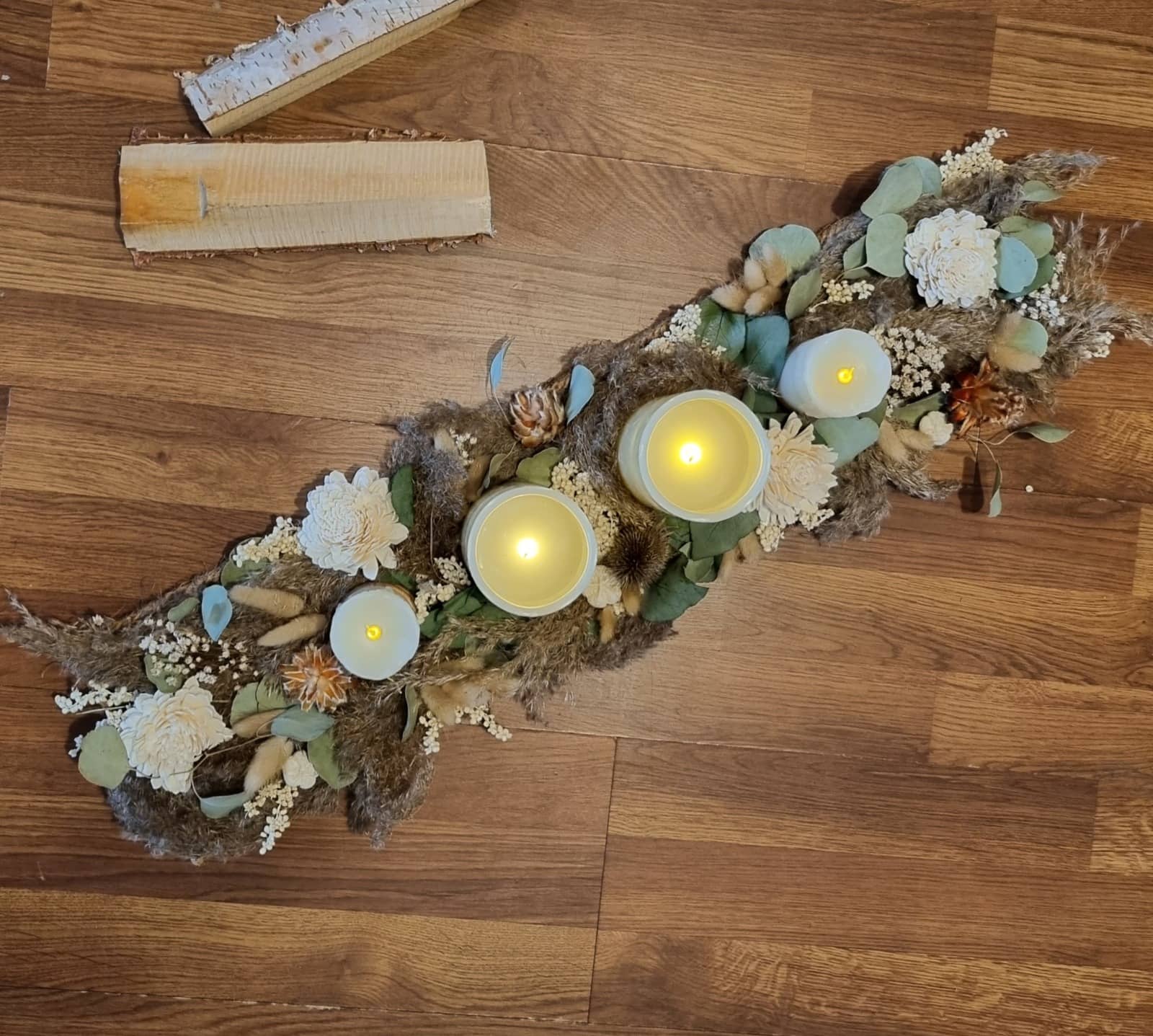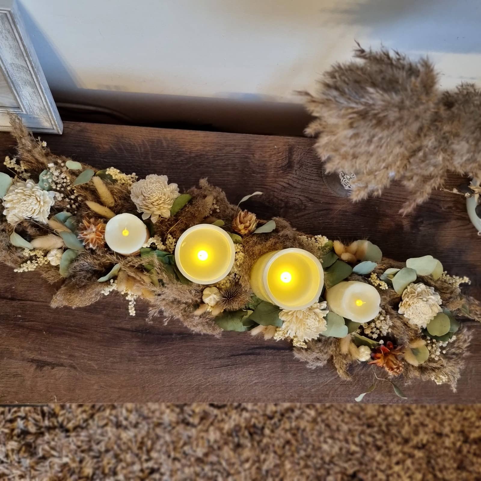 Materiale: lumânări din ceară naturală cu led, flori stabilizate, eucalipt, gypsophila, lagurus, pampas