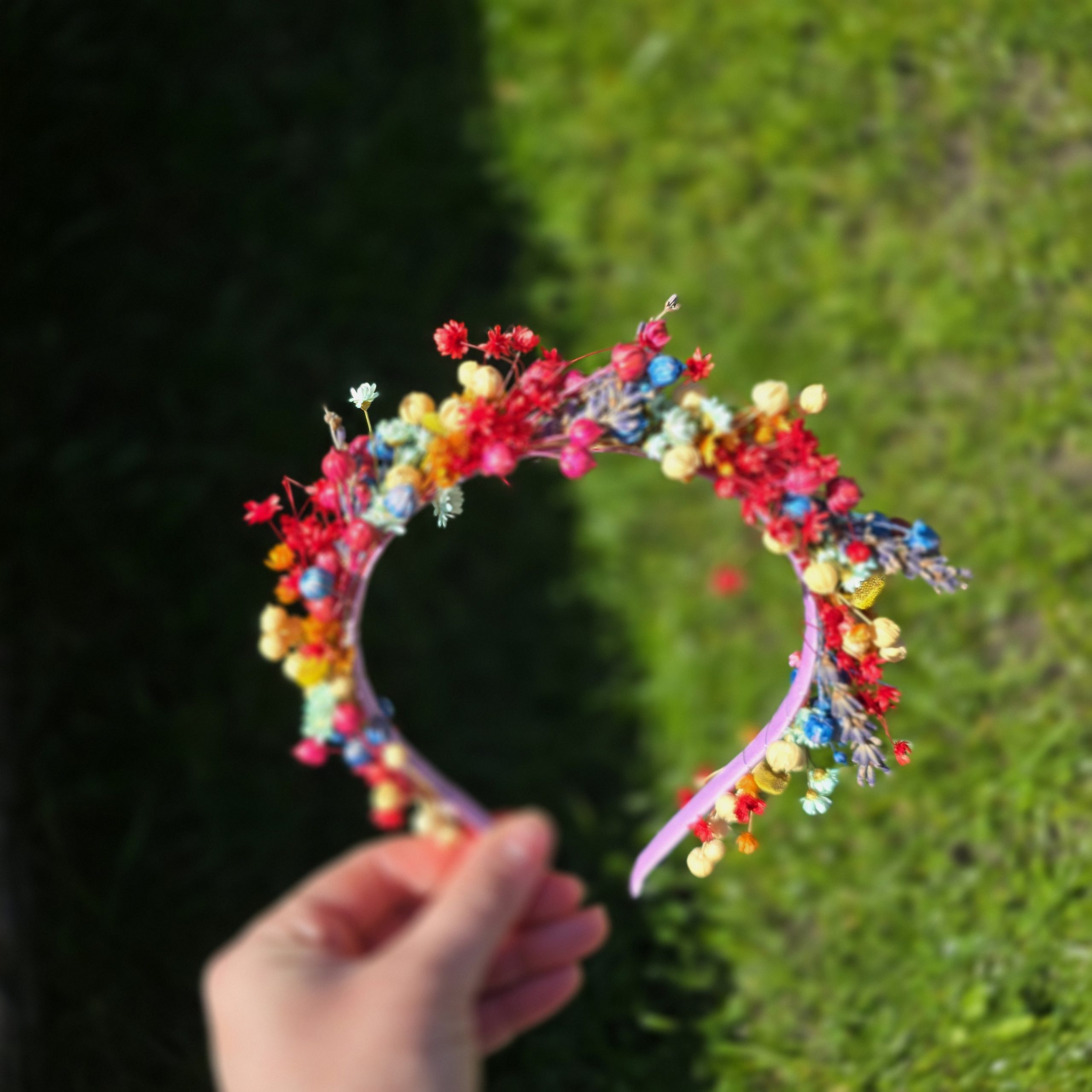 Adaugă o notă de magie naturală ținutei tale cu această coroniță unicat realizată manual din flori uscate în nuanțele vibrante ale curcubeului. Fiecare floare este atent selecționată și uscată natural pentru a păstra textura, forma și culoarea autentică, oferind o eleganță rustică și boemă în același timp.