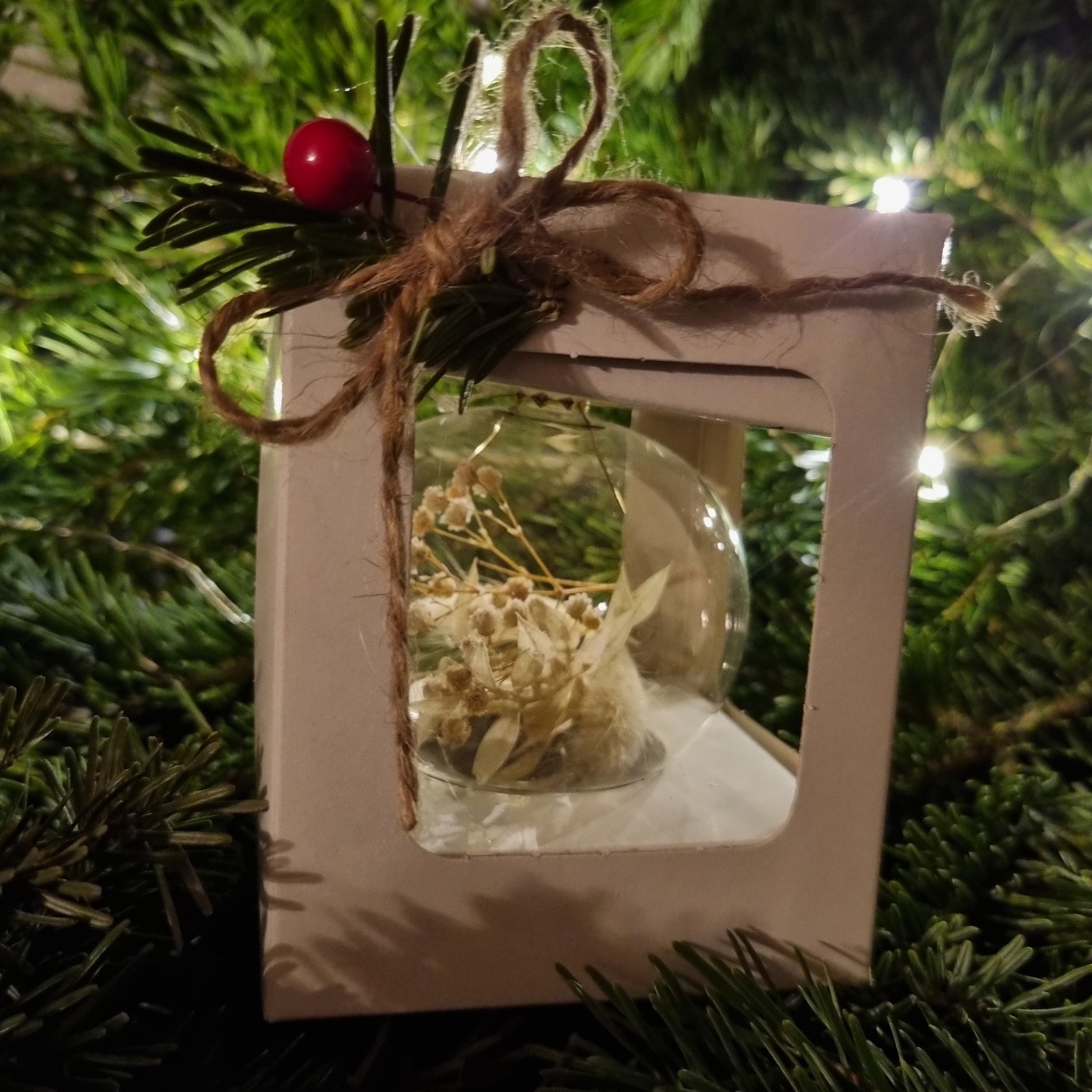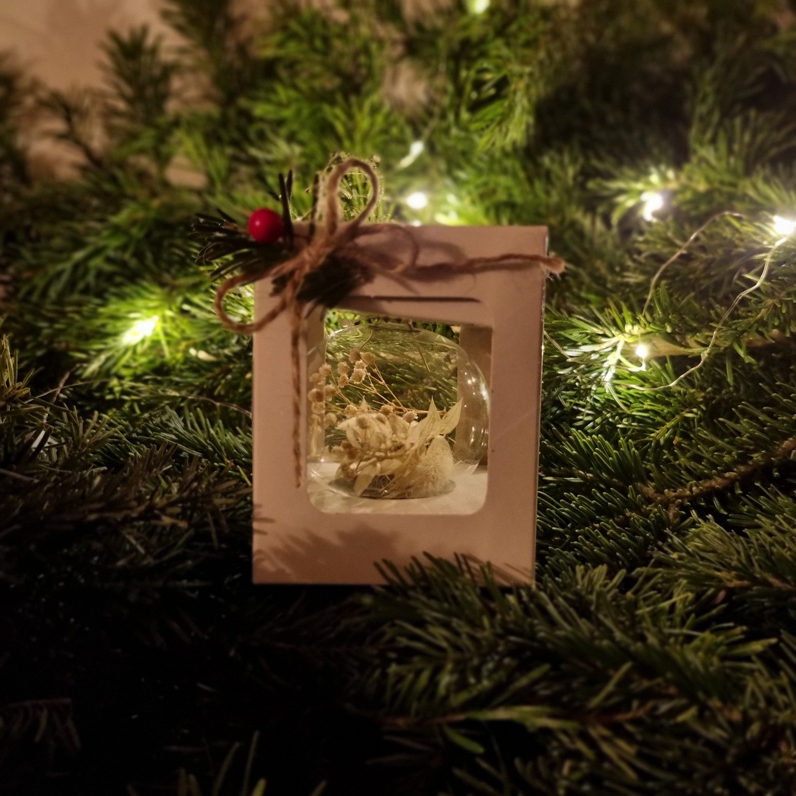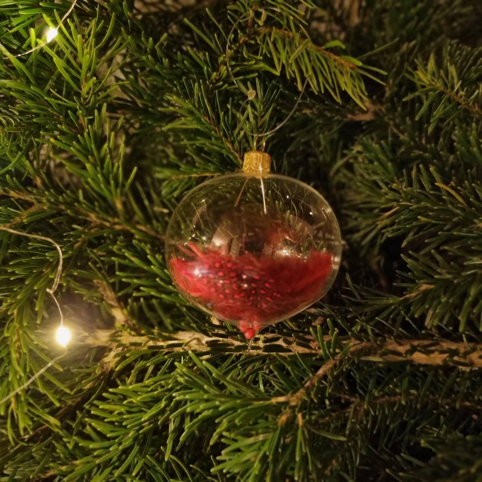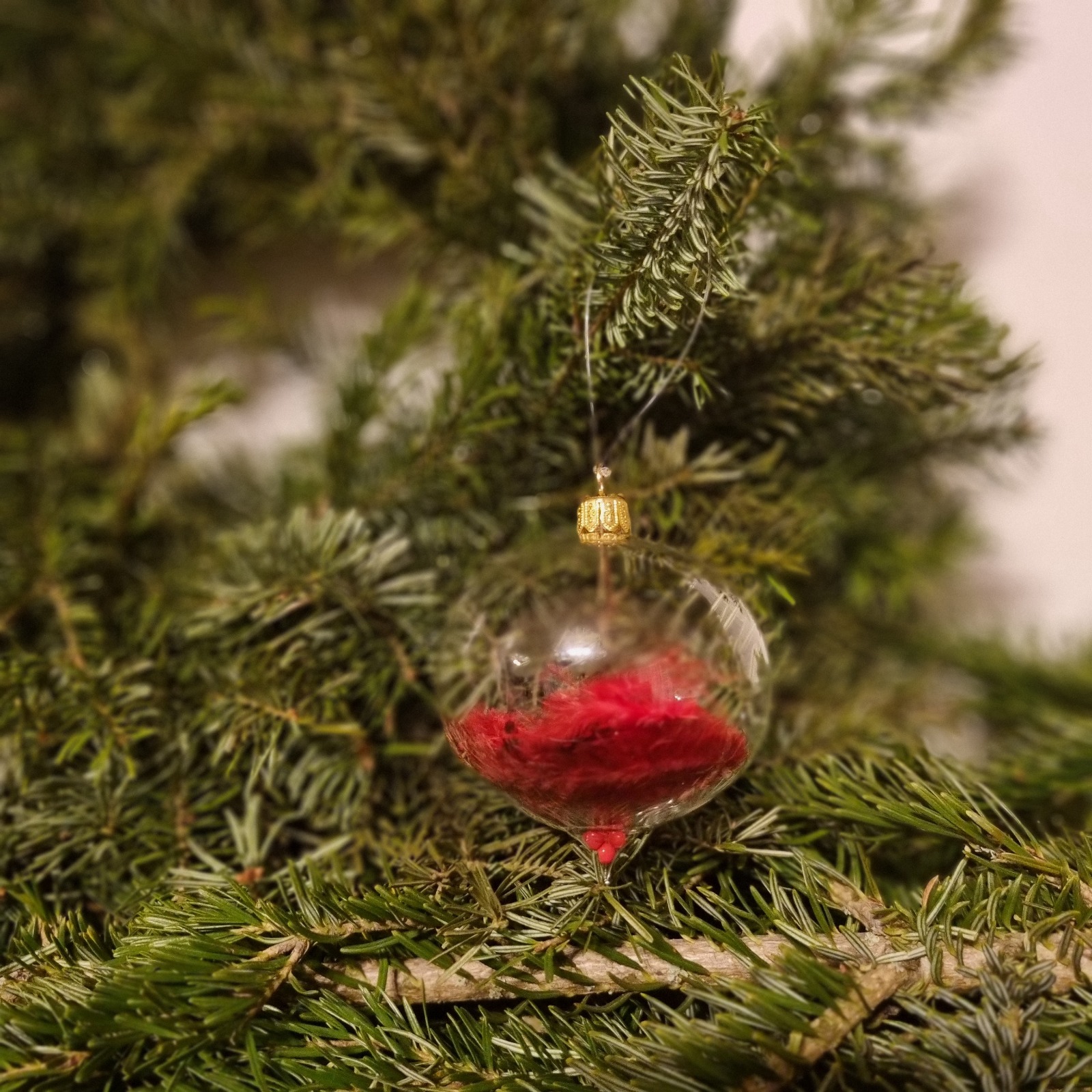 Materiale: glob din sticlă, pene rosii, ruscus verde si rosu, ruscus crem+ gypso