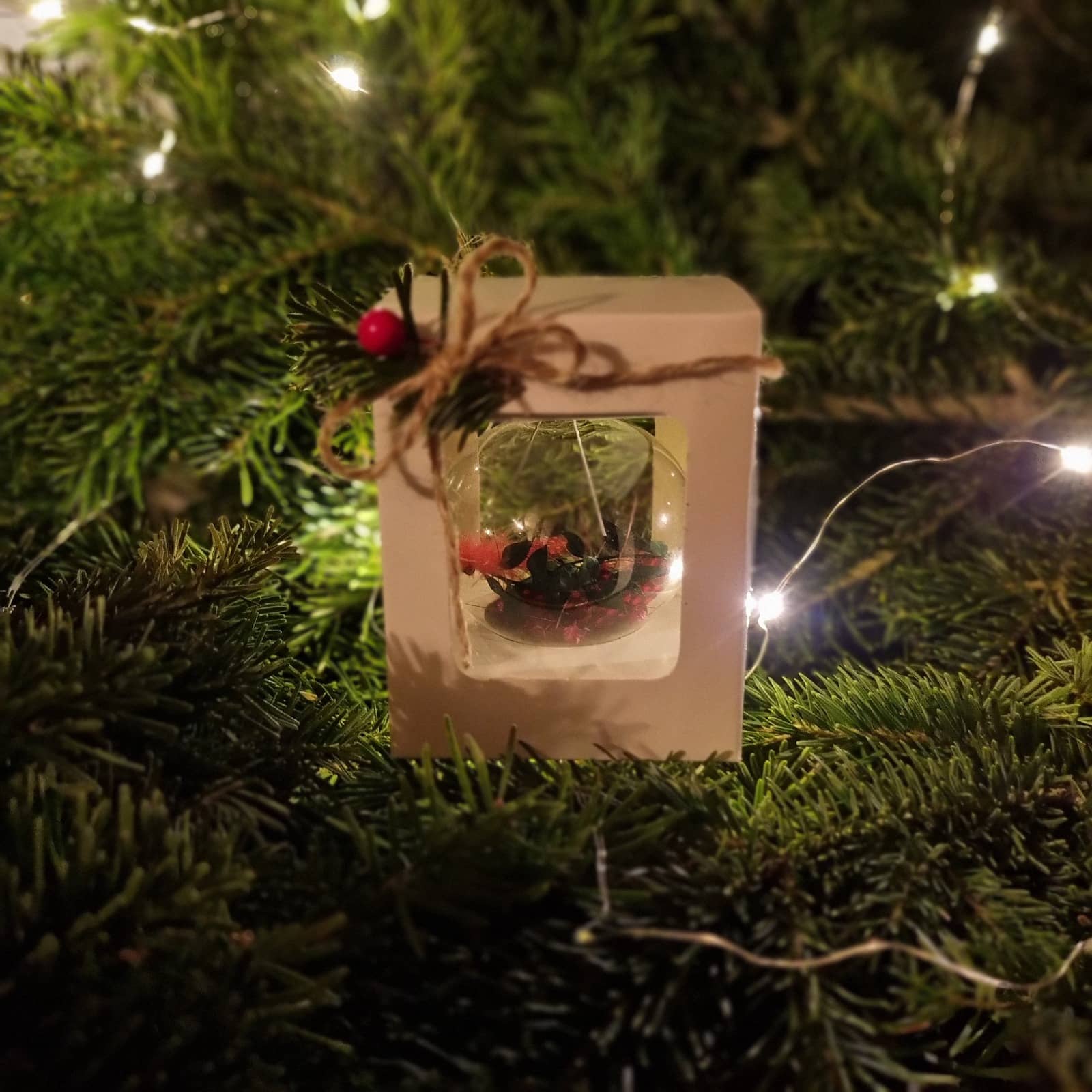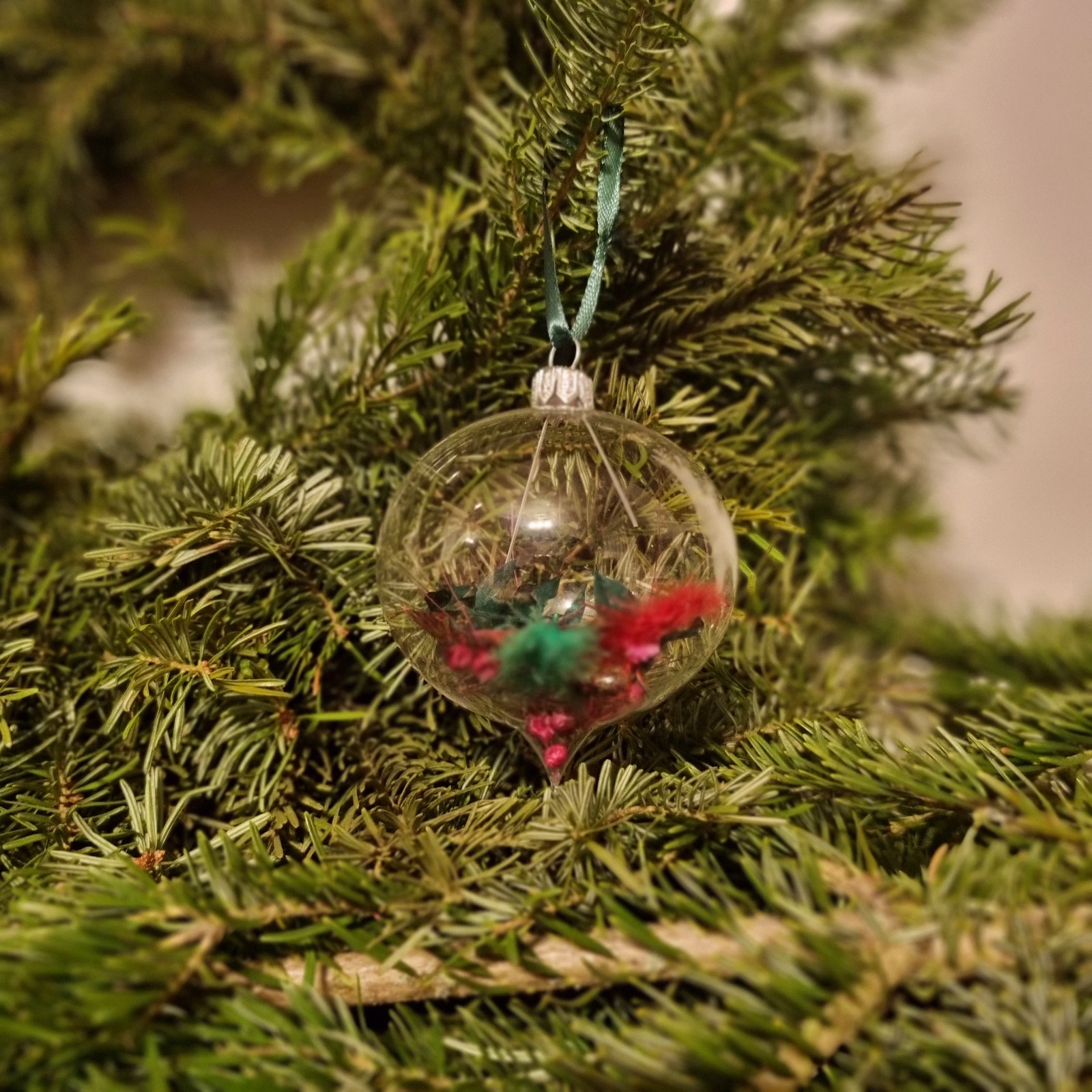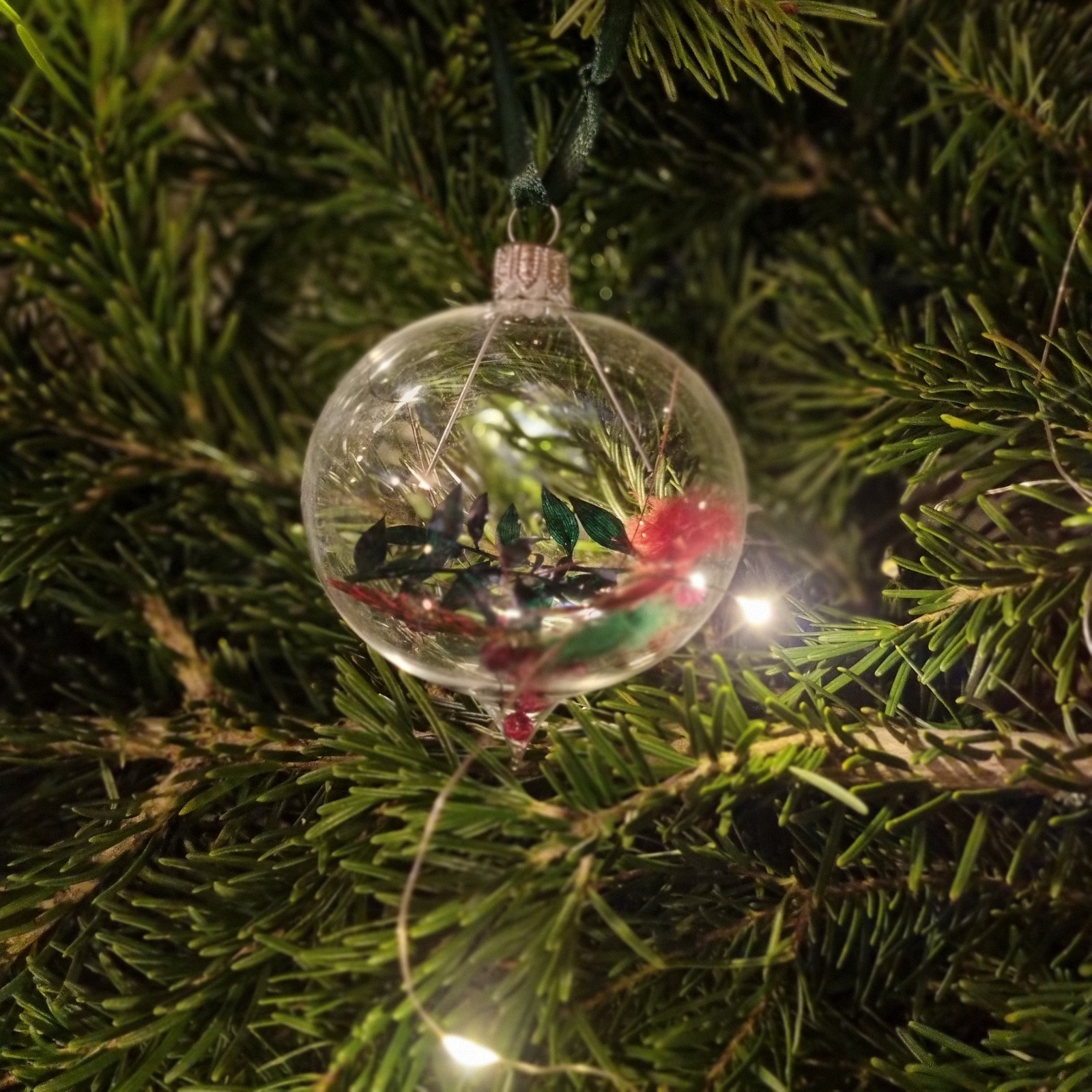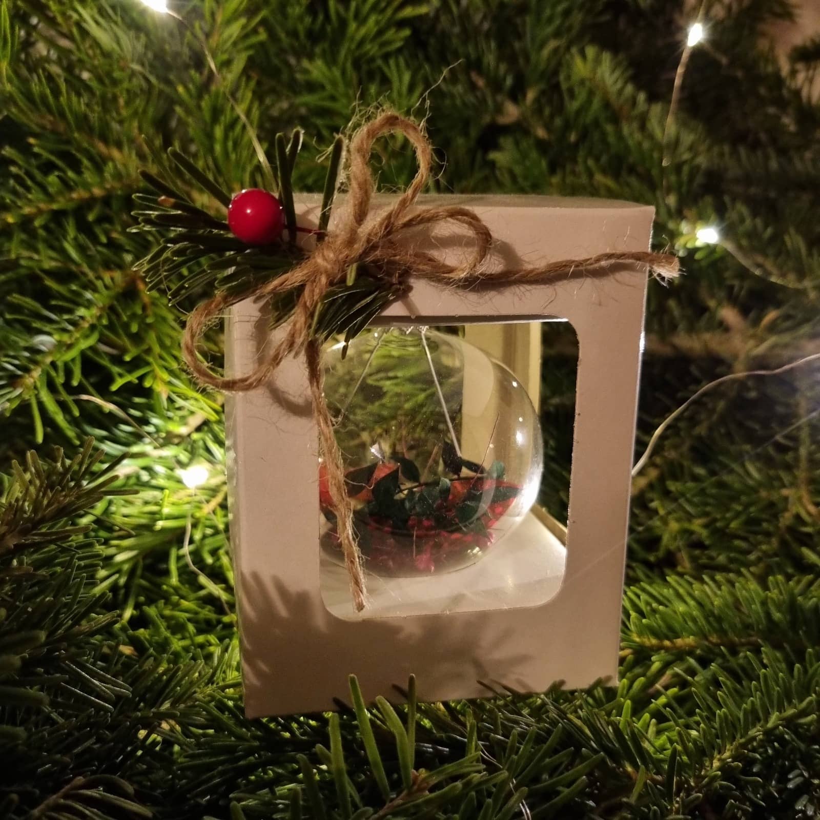 Materiale: glob din sticlă, pene rosii, ruscus verde si rosu, ruscus crem+ gypso