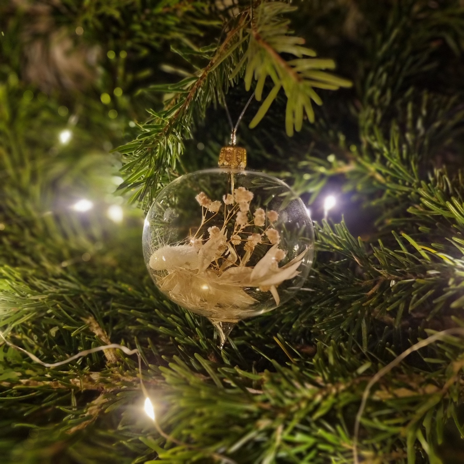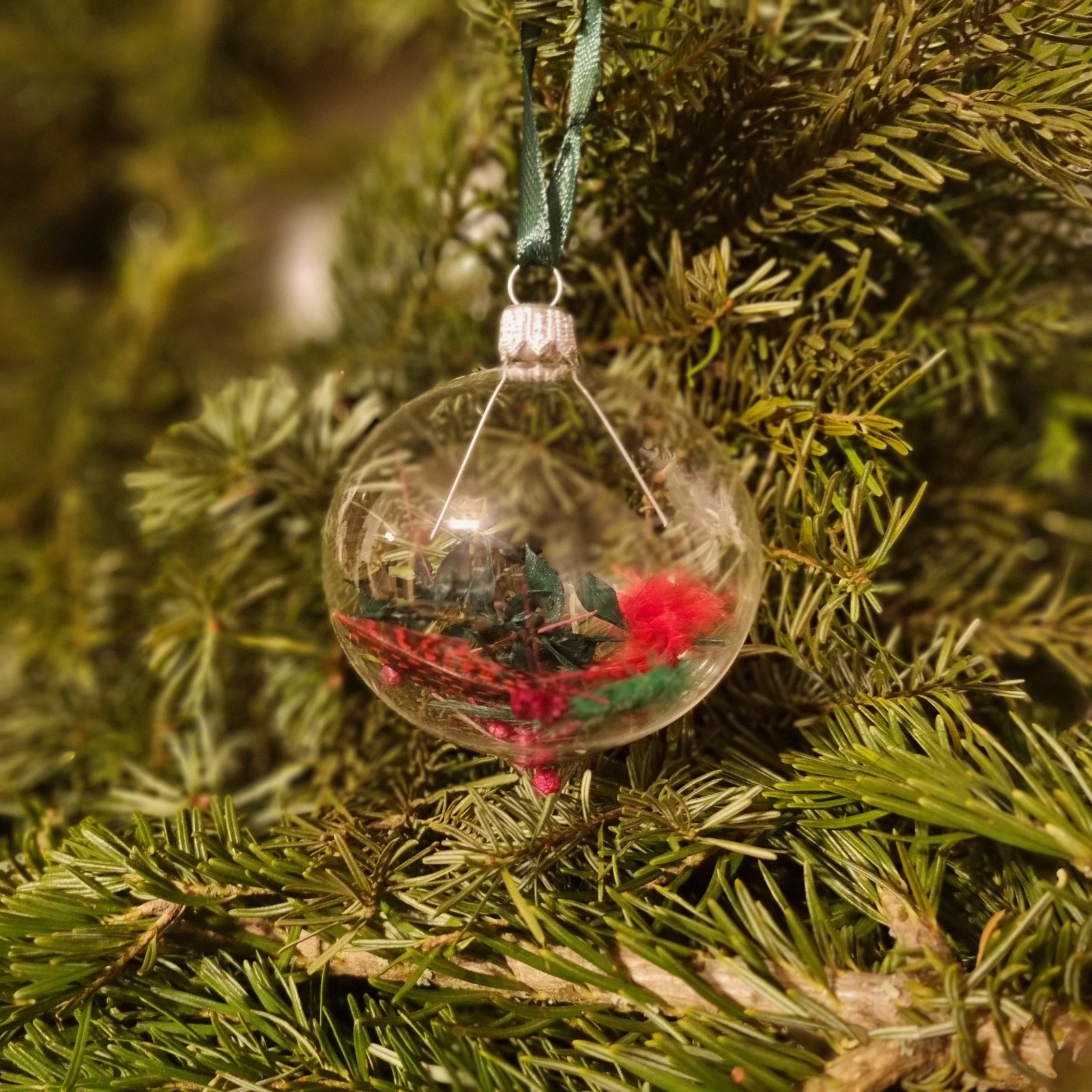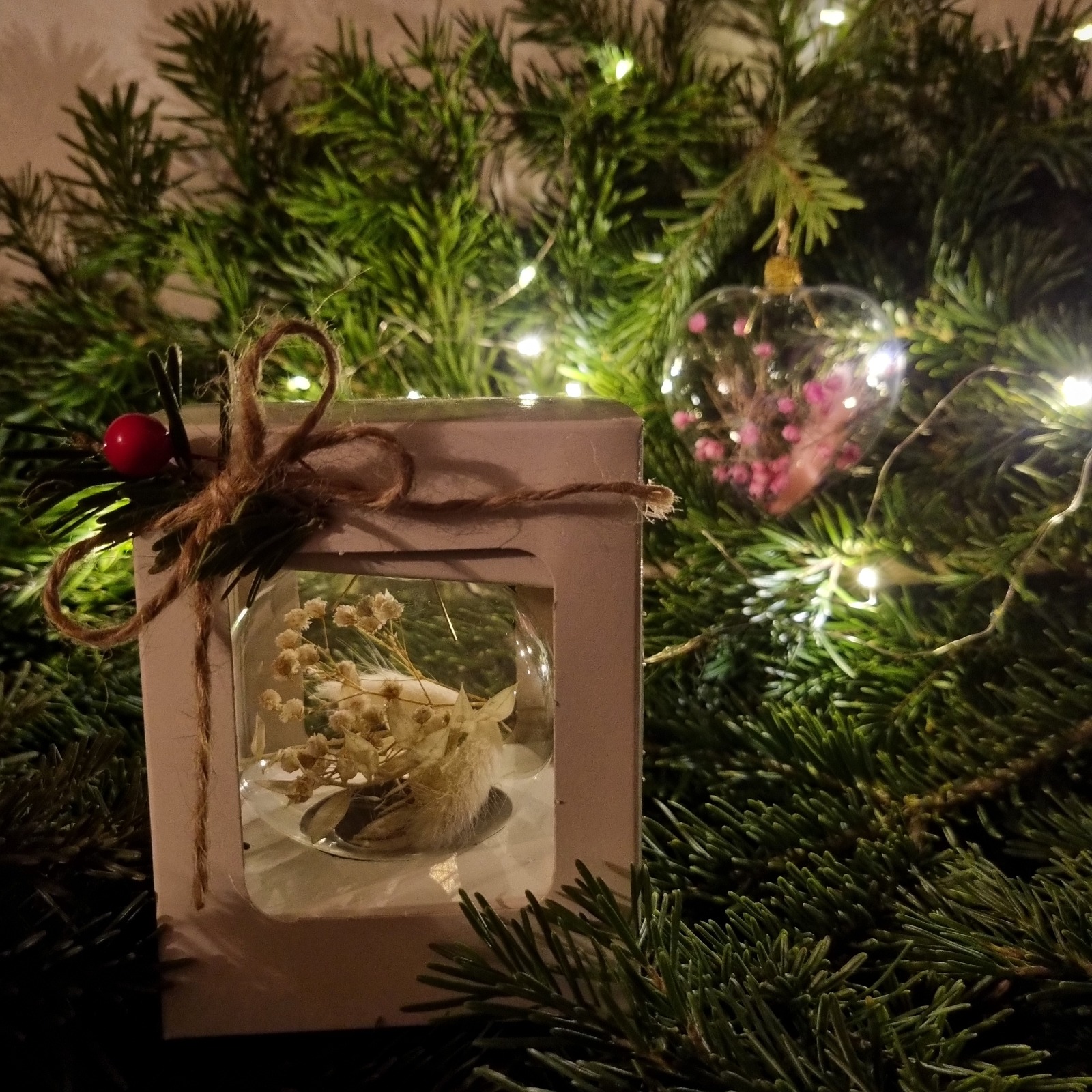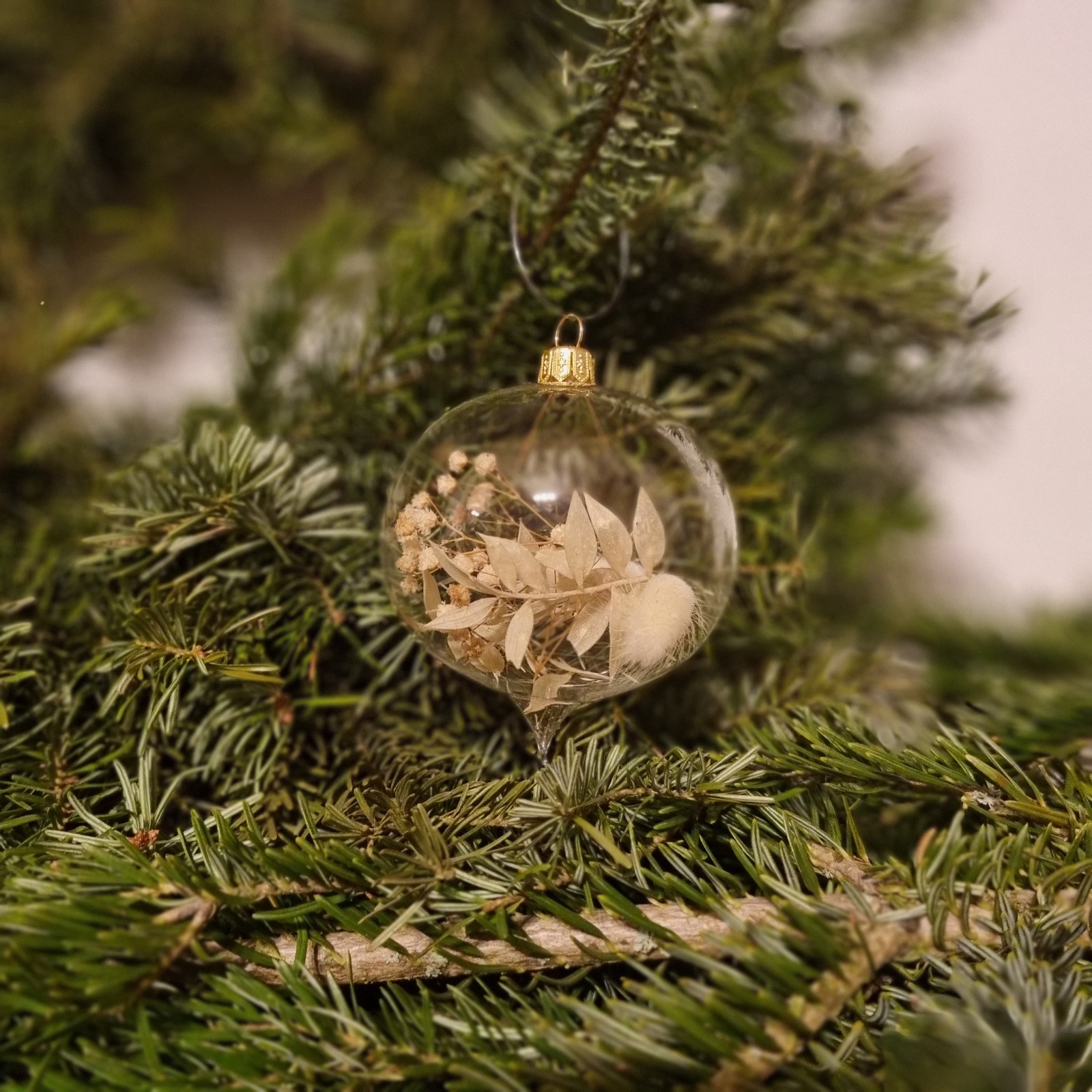 Materiale: glob din sticlă, pene rosii, ruscus verde si rosu, ruscus crem+ gypso
