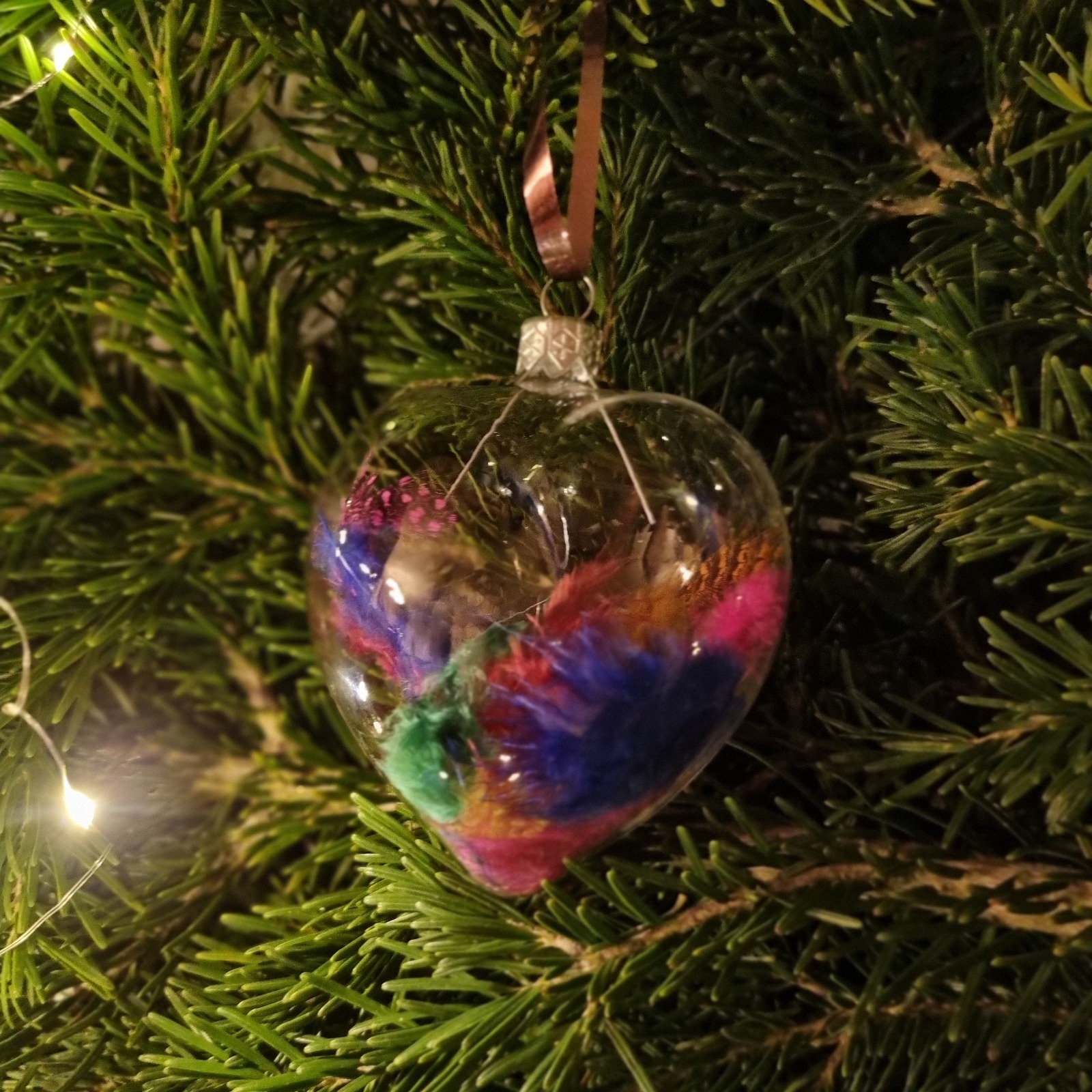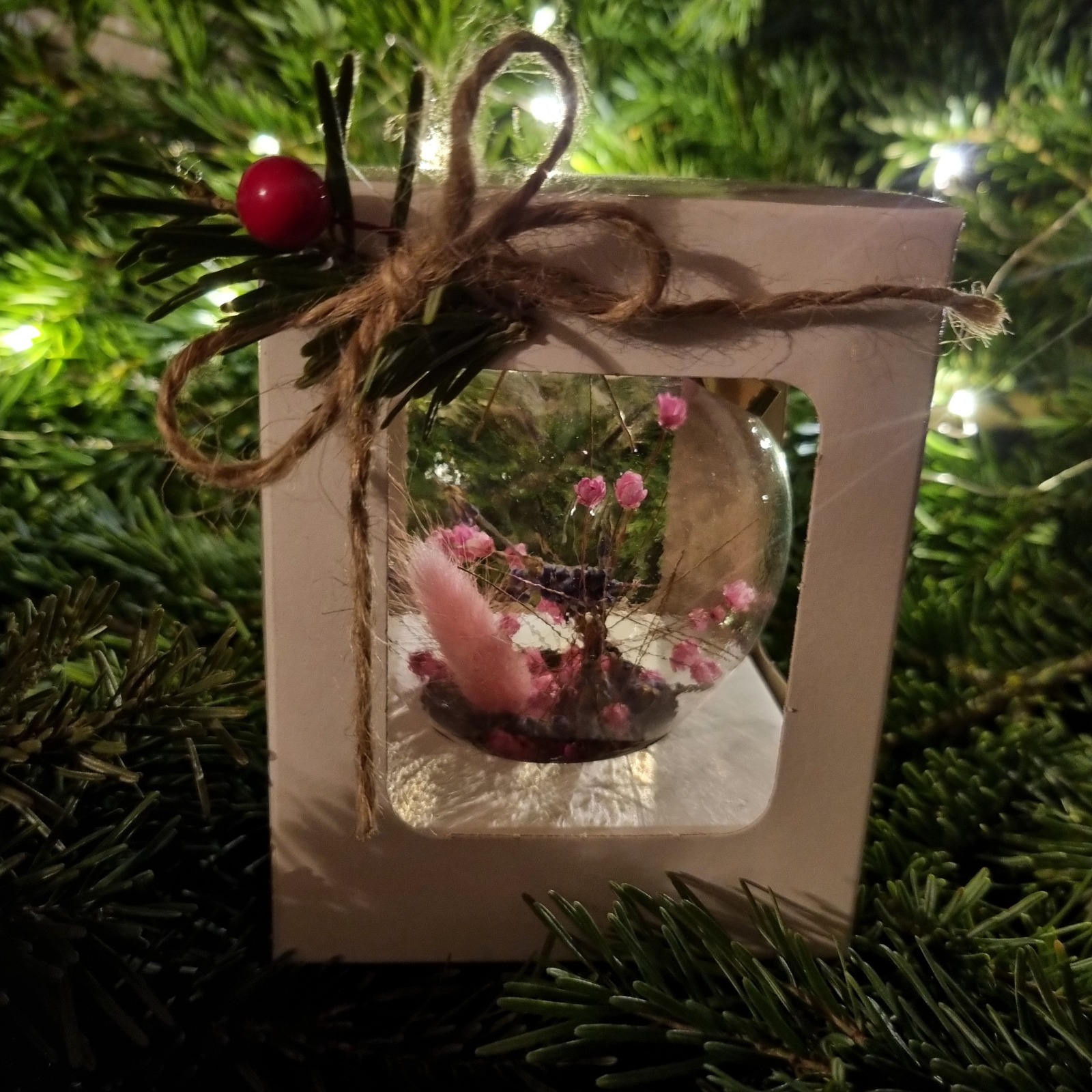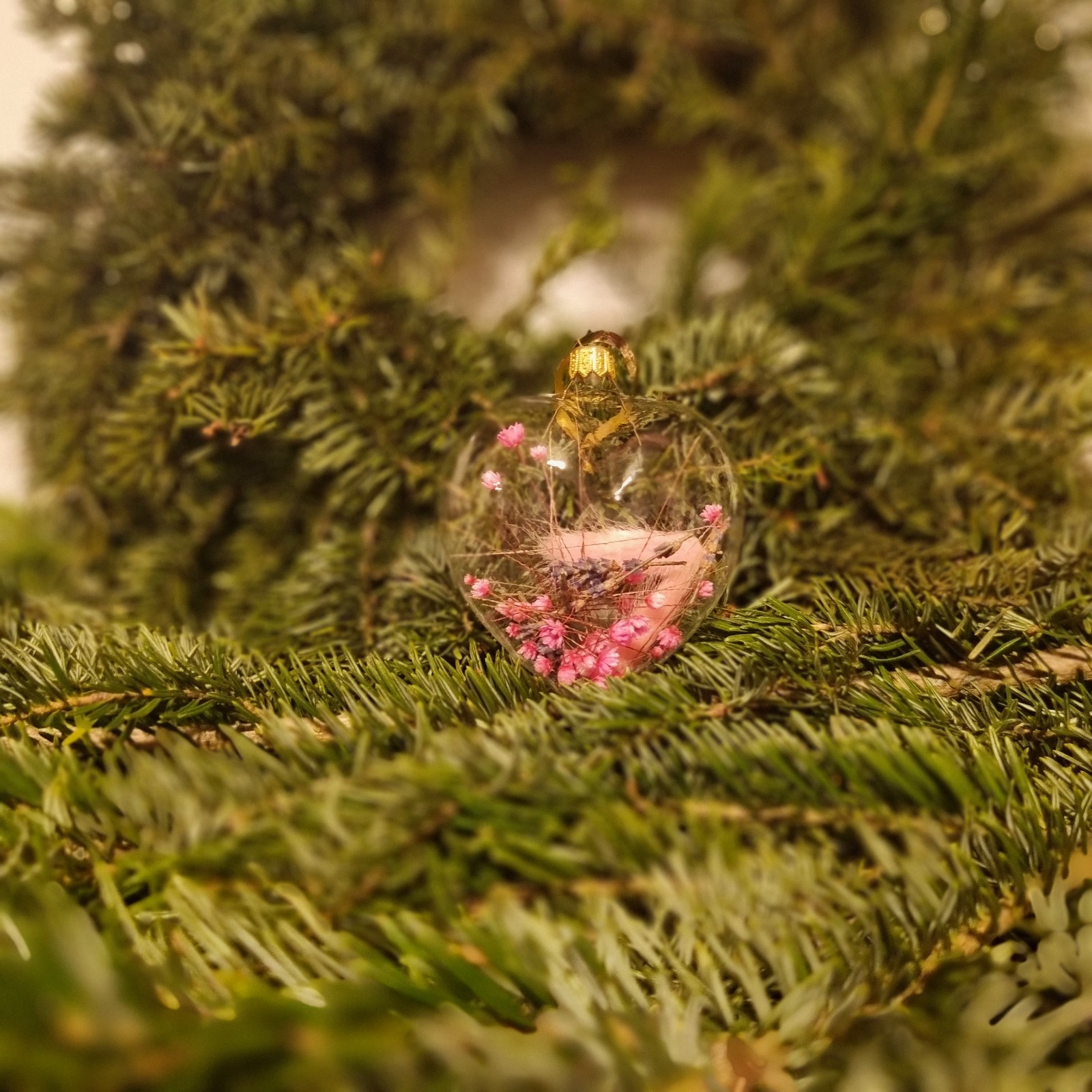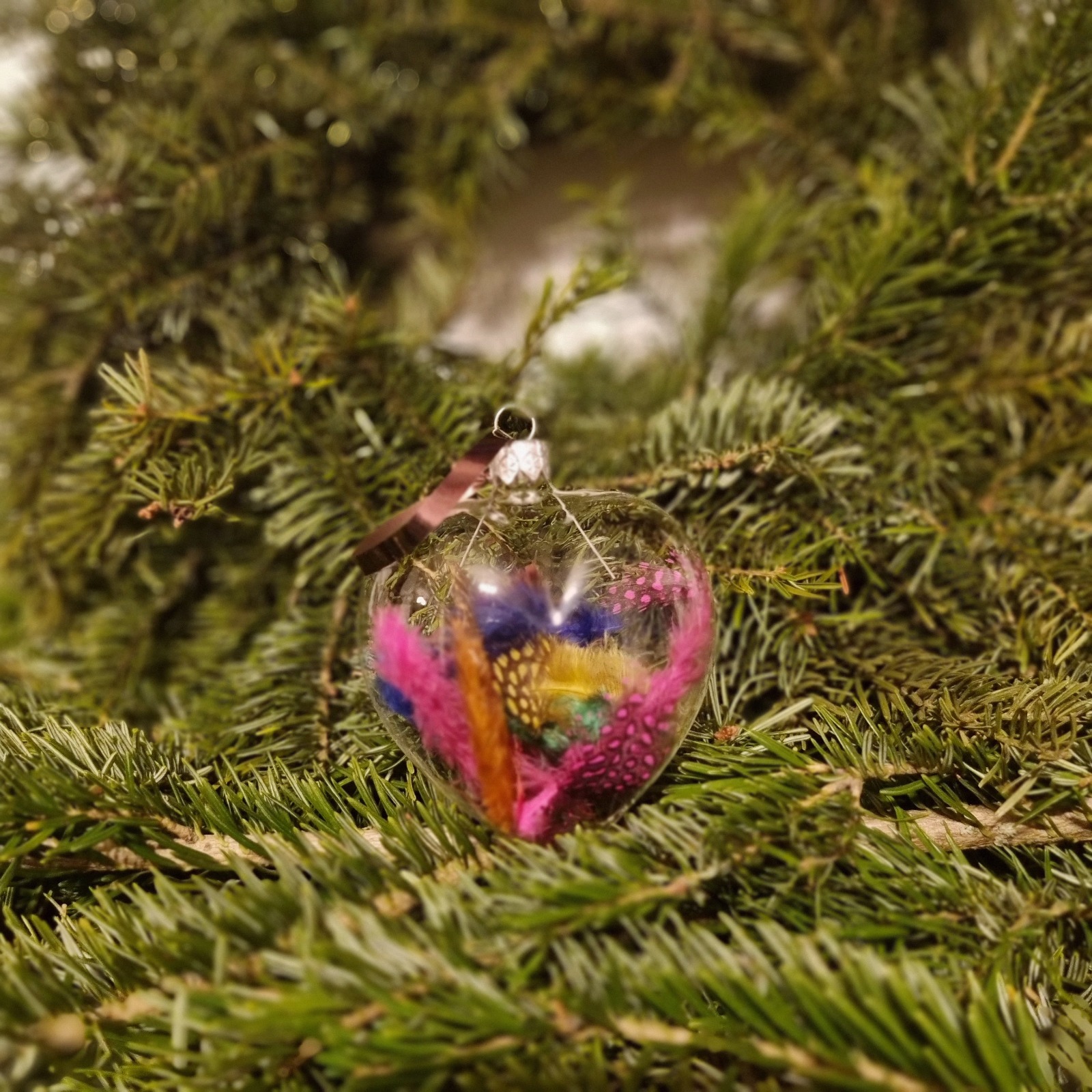 Materiale: glob din sticlă, flori roz, pene multicolore