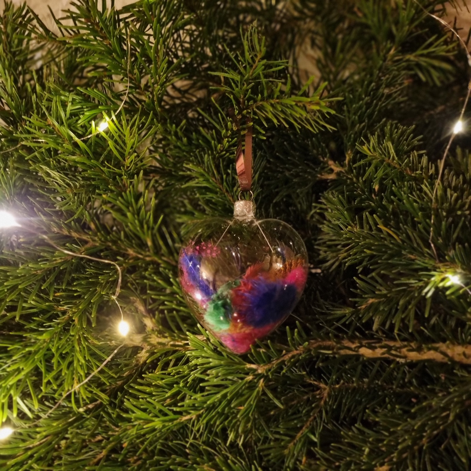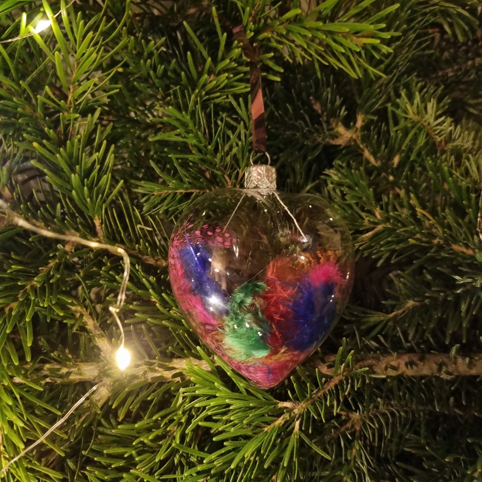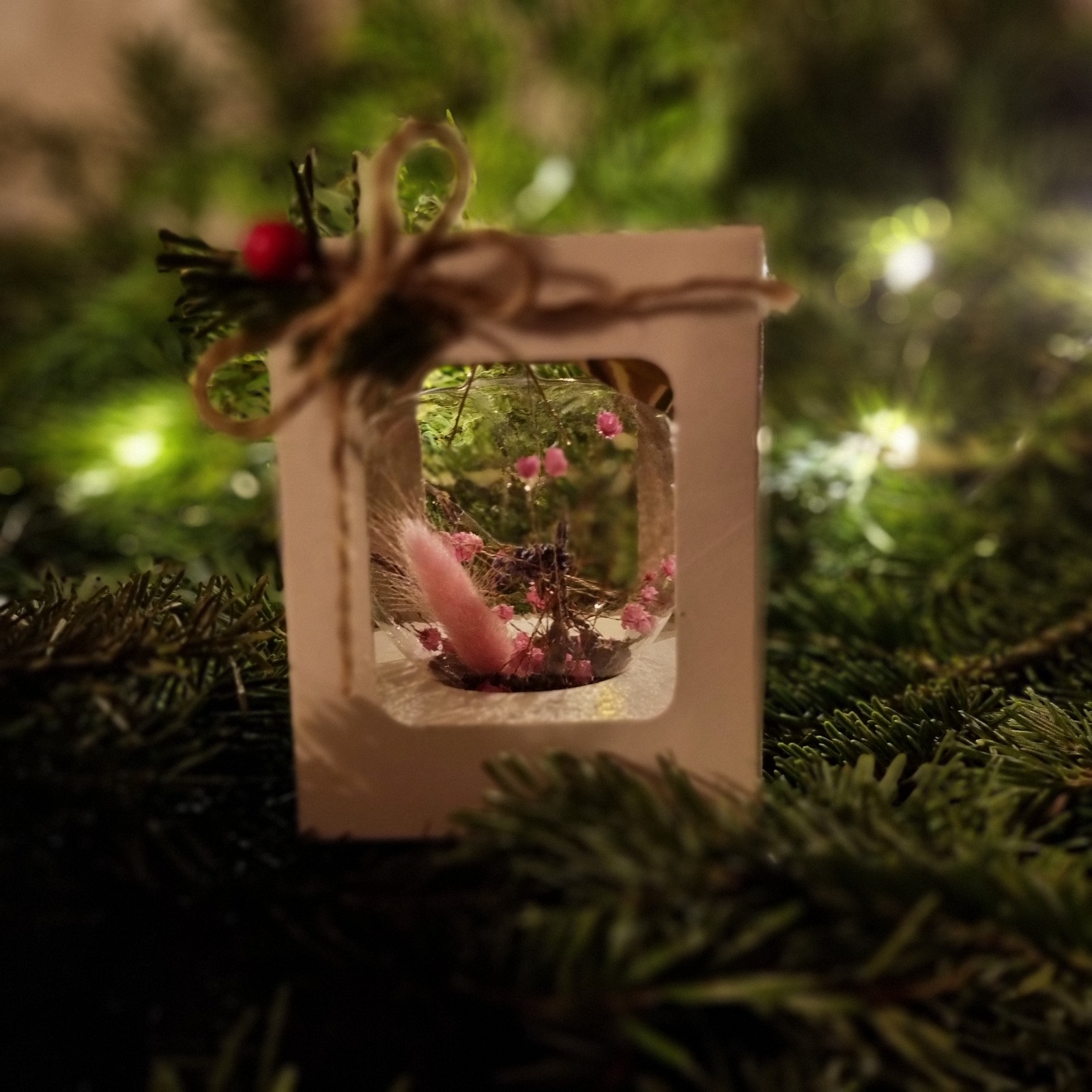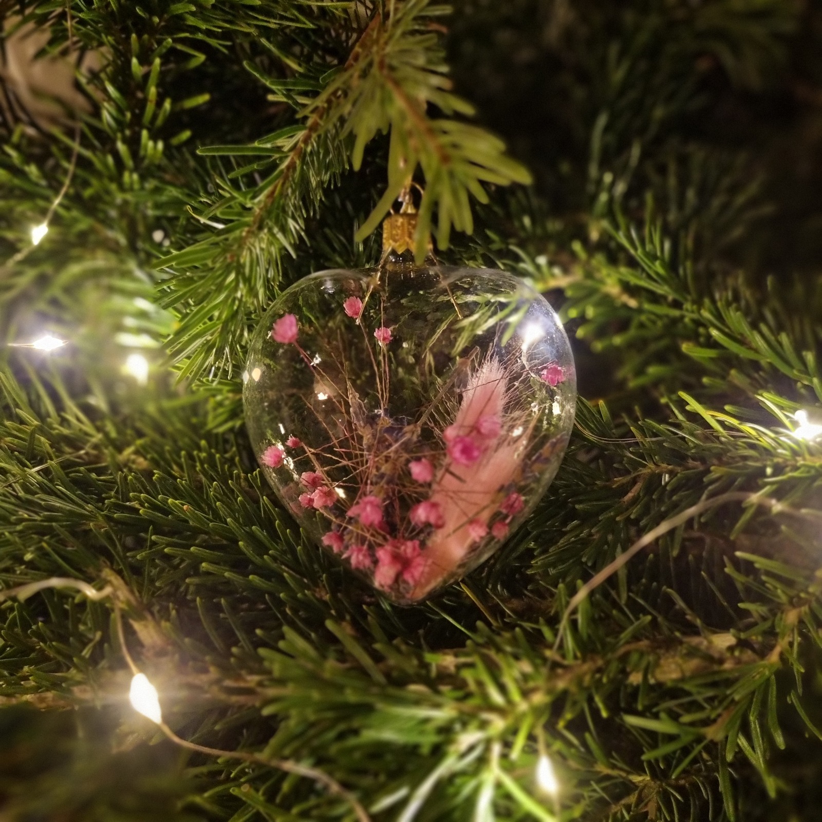 Materiale: glob din sticlă, flori roz, pene multicolore
